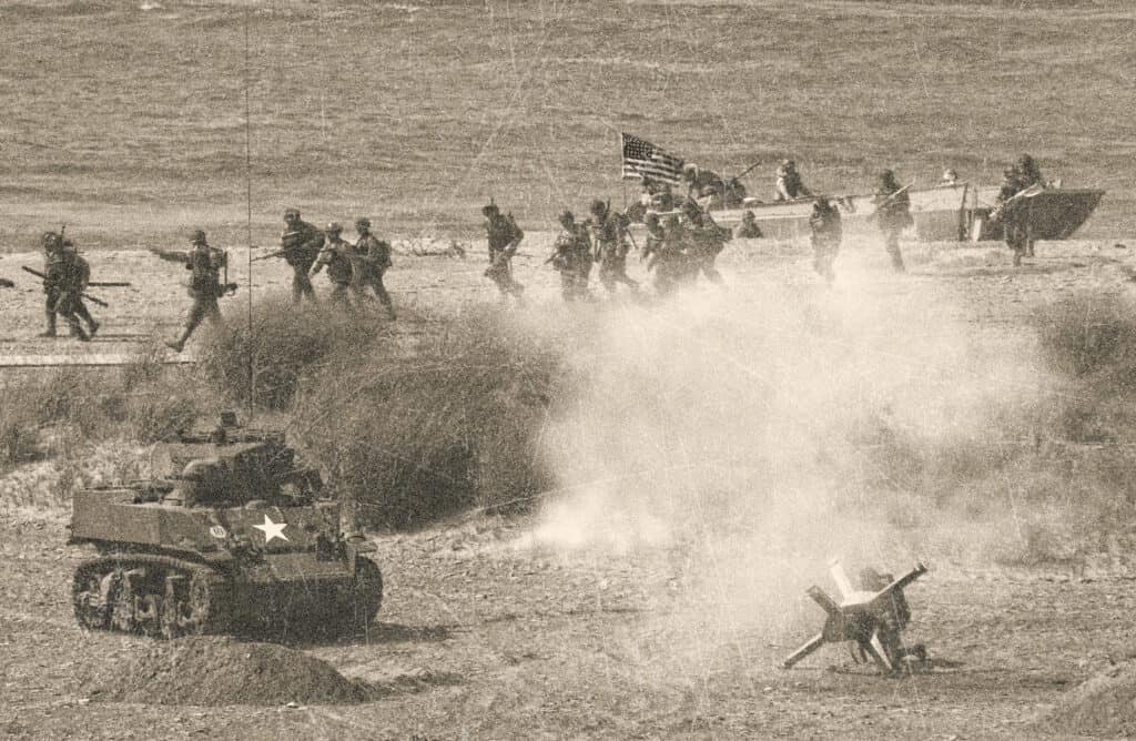 US soldiers invading Omaha Beach on D Day